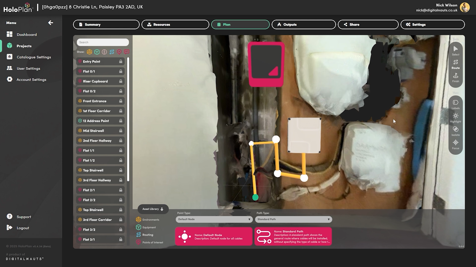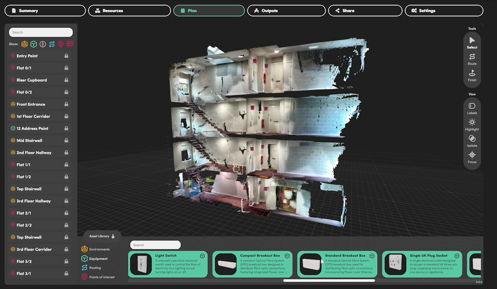 LiDAR-supported scan of the building, including parallel planning of the installation route